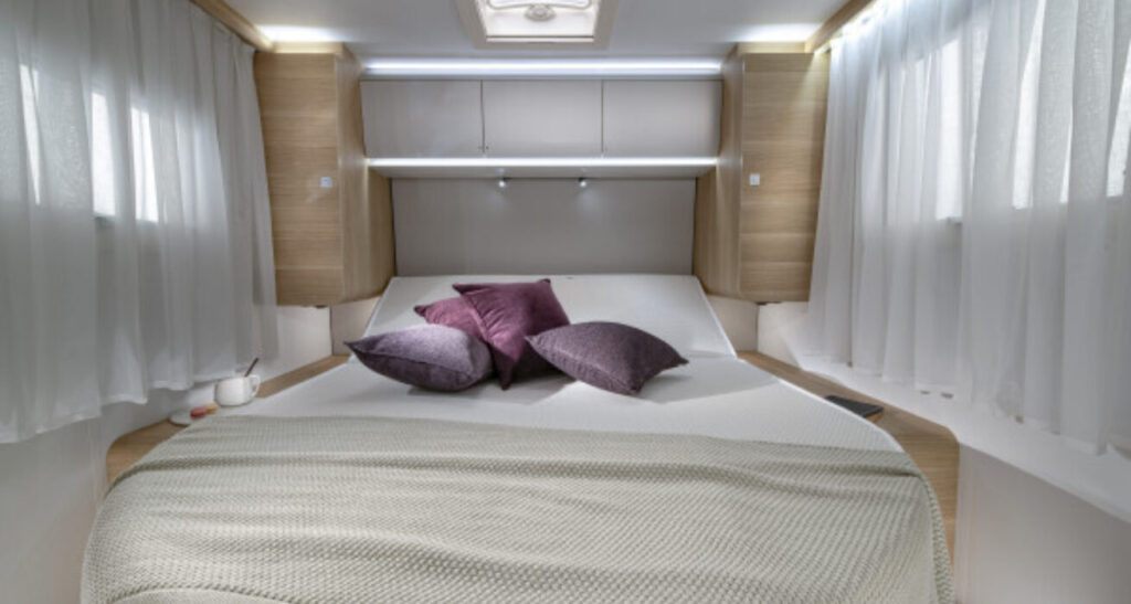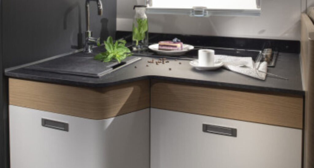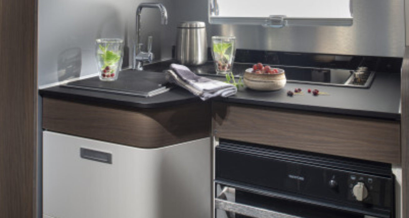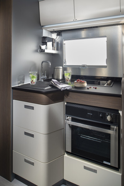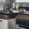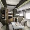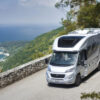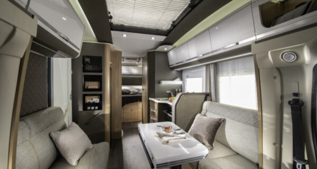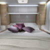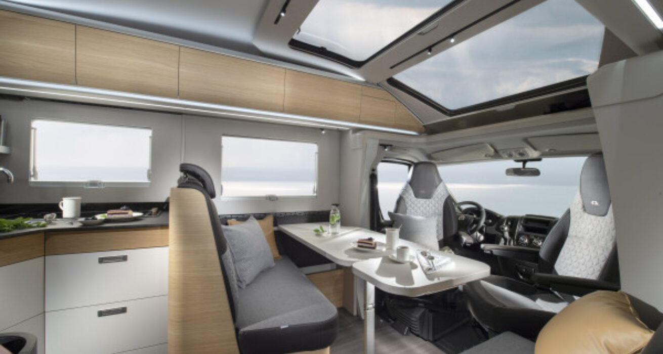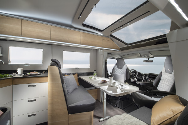 Coral Supreme. De ultieme semi-integraal camper met zilvergrijs metallic aluminium opbouw, het meest luxe interieur en het hoogste uitrustingsniveau. Symphony White interieur met bekledingskeuze en bijpassende decoratieve accessoires.